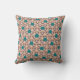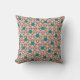 This throw pillow has a geometric design of repeating brown and tan triangles with turquoise circles on top on a field of off-white. Want the same design in different colours? Message me.