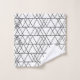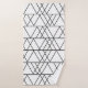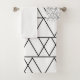 This towel set has a mid-century modern design of overlapping white triangles made with black lines running horizontally.