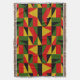 This throw blanket has a Black History design of triangles and rectangles in gold, red, green, and black making a pattern.
