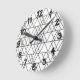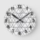 This all clock has a mid-century modern design of white triangles running horizontally made with black lines.
