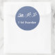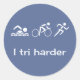 White design on blue for a fun sticker for a triathlete. "I tri harder" caption with pictogram icons of the three triathlon disciplines.