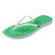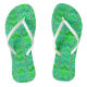 Flip flops in an African inspired contemporary take on a tribal textile print, rendered in a batik dyed texture - shades of light to deep jade green and lime green, accented with white and teal