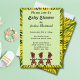 Baby shower Invitation. Abstract in yellow to green shades. Tribal dancers at the bottom of the front card. Design all zigzags to the centre. Let's go tribal with this trendy abstract design on the front and back of this flat card. Replace the information with your own. All customisation is available for the front and back of the card.