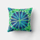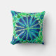Throw pillow in a modern tribal / ethnic print of nested mandala wheels and triangles, with a tropical feel - shades of deep cobalt blue, turquoise, cerulean blue, aqua, jade green, and chartreuse, accented with white