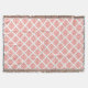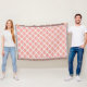 A geometric tribal key and angular cut out style patterned throw in warm coral orange pink and white, or select your own background colour. Designed by Sarah Trett. Would look great in a bedroom, lounge.