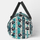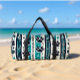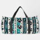 This stylish duffel bag features a unique tribal-inspired pattern in shades of teal and blue, adorned with decorative paw prints and striped accents. It's a functional gear bag and portable Weekender, durable for travel or the gym.