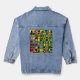 This denim jacket flaunts an abstract tapestry in a variety of shades of blue, pink, purple, turquoise, yellow, green, black, lavender, tan and more!