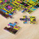 This challenging jigsaw puzzle flaunts an abstract tapestry in a variety of shades of blue, pink, purple, yellow, green, black and more more!