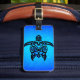 Black tribal Polynesian tattoo style turtle design with a colourful Hawaiian pattern of blue hibiscus flowers.
