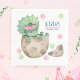 Dinosaur theme girl first birthday party napkins feature a cute triceratops hatching out of an egg with pink and green dinosaur tracks. Art by KL Stock