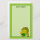 This cute personalised dinosaur kids stationery paper has a cartoon Triceratops on the front. It has three horns and is eating some green leaves. The background paper is green with a green border.