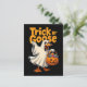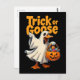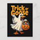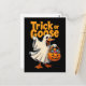 Funny Halloween goose in a spooky ghost costume with a pumpkin bucket full of candy. Perfect for humour-loving fans of Halloween and mischievous birds.