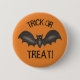 Button design features an original marker illustration of a spooky flying black Halloween bat, on an orange background. Trick or treat!