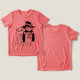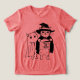 Girl's Halloween t-shirt of a little witch cat holding a treat bag with text "TRICK OR TREAT", as a ghost looks on.