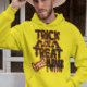 Step into a world of enchantment with our captivating Halloween hoodie. The carefully curated mix of Halloween fonts brings the statement Trick or Treat? Treat please to life, casting a spell of anticipation and excitement. The black type, adorned with an ethereal orange glow, adds a touch of mystique, perfectly capturing the essence of this spooky season.