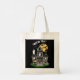 Trick or treat Halloween haunted house and little witch black tote bag, featuring a haunted house with cute ghosts, bats, black cats and a little witch on black background.