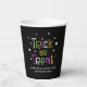 Halloween paper cups featuring white stars and the text "Trick or treat" in a orange, purple, white and green, whimsical and angular letters with a custom message below.