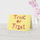 These fun Halloween greeting cards feature the words, Trick or Treat. Some of the letters in the words include a broom, witch legs, candy designs, and a pumpkin. The letters are light orange outlined with a red orange. The letter k is made of a broom and witch legs wearing black and orange striped stockings. A display of candy is pictured below the words. The background colour is yellow and it can be customised to any colour of your selection. Thank you for shopping CherylsArt on Zazzle.