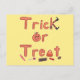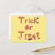 These fun Halloween postcards feature the words, Trick or Treat. The words include a broom, witch legs, candy designs, and a pumpkin. The words are light orange outlined with a red orange. The letter k is made of a broom and witch legs wearing striped stockings. A display of candy is pictured below the words. The background colour is yellow and it can be customised to any colour of your selection. Thank you for shopping CherylsArt on Zazzle.