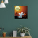 A Halloween Ghost going for Trick or Treating with a pumpkin bucket in his hand. Flying bats, moon, dry trees and leaves in the background.
