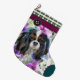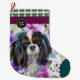 Christmas stocking with Tricolor Cavalier king charles spaniel art design. floral. Holiday Art stocking. green and magenta colours. chequered traditional pattern.