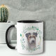 Each side of this mug has a beautiful watercolor portrait of an adorable tricolor Jack Russell Terrier Dog in a blue green leaf wreath. Between the two images is text which says "JACK RUSSELL TERRIER" in black. The text may be easily changed, or even removed, if you prefer.