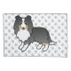 Destei's original cartoon illustration of a cute Shetland Sheepdog breed dog in tricolor coat colour. The background has a pattern of grey dog paw prints.