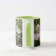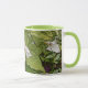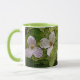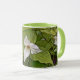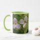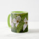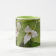 TRILLIUM BLOSSOMS AND BRIGHT GREEN FOLIAGE SURROUND THIS COFFEE MUG.