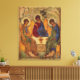 Trinity Angels At Mamre beautiful mediaeval christian painting by andre rublev of his interpretation of the trinity with three angels with golden wings, halo, green, blue, and gold cloaks, sitting together around a table with a golden bowl. mediaeval times illustrative fine art painting in blues, golds, and greens, in a delicate and refined religious painting. beautiful golden colours in a stylised and stylish design and colours with elegant lines and crisp fresh golden colours with shabby but colourful and radiant effect.