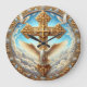 This ornate wall clock features a radiant golden cross, symbolising the Holy Trinity, set against a serene sky with clouds. Two doves, representing peace, flank the cross. The clock's border is intricately decorated, adding to its reverent and artistic beauty. Perfect for adding a touch of spiritual elegance to any space.