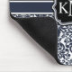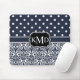 Flourish filigree damask pattern and polka dot print in white and navy blue with custom trio of initials for your first, last, and middle name. Cute elegant trendy girly three monogram design. Cool gift for girls that want a personalised gift that features their 3 initial letters.
