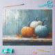 A cosy autumn-inspired impressionist painting featuring three pumpkins, orange, white, and blue, resting on a weathered wooden table. Warm fall leaves and textured brushwork enhance its rustic farmhouse charm.