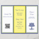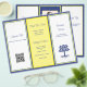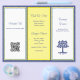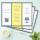 Tri-fold brochure template in dark blue, yellow and white. Include a personal photo for the "about" section, a QR code, and logo as needed. The blue tree image on the front panel can become your logo. Neutral colours grab attention and work for nearly all types of businesses. Customise with header text and smaller print on six panels between two sides of 8x11 inch paper. Changing the paper size may alter the design to not fit properly.