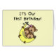 Triplets First Birthday T-shirts, bodysuits, tote bags, buttons, magnets, cards, and more featuring two boys and one girl monkey and a big yellow banana!