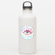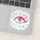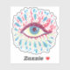 Psychedelic eye sticker with a colourful illustration of a blue eye looked from the side over dark blue customisable background. The eye is wide open in amazement and blue, white and pink splashes come out of it instead of tears.