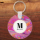 A keychain with a cool trippy psychedelic design. Pink, orange and hints of blue all swirling around. Retro hippie vibe.