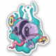 This psychedelic image features a skull with a wide, toothy grin, its eyes replaced by swirling vortices of colour. The skull's head is split open, revealing a chaotic interior of swirling shapes and lines. Flames of toxic green and yellow erupt from the skull's mouth, adding to the overall sense of chaos and disorientation. The background is a swirling sea of turquoise and blue, further enhancing the trippy and surreal atmosphere.
