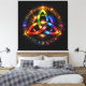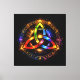 Rainbow-colored luminous triquetra symbol surrounded by a mystical circle adorned with esoteric glyphs, on a starry cosmic background.