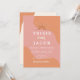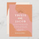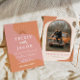 This wedding invitation card features a bohemian arched photo design, fun orange swirls, a bright pink background and retro font and sunburst. Easily edit all colours to meet your needs and swap out the photos on the front and back for a personal touch.