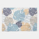 Kitchen towel with tropic pattern of blue and yellow monstera leaves.