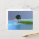 Postcard with my digital artwork of a peaceful island scene with palm trees surrounded by a blue sea.