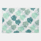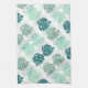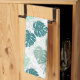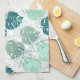 Kitchen towel with teal and grey monstera leaf pattern.
