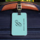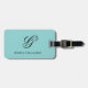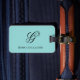 This soft turquoise monogram luggage tags is customisable, and is reminiscent of tropical tides. Personalise this turquoise luggage tag with any initial and any name which appears in black font. The monogram appears in scripty style font, and the remainder of the text is in crisp, clean all-cap font. Personalise the other side of the luggage tag with up to four lines of text for identification (name, street address, city, state, zip code and telephone number).