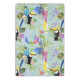 Abstract shapes and squiggles match up with tropical foliage and toucans and parrots. Cheerful colours of aqua, green, hot pink, sunny yellow, and black and white make a multicolored palette.