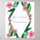 Tropical Palms Watercolor Bridal shower invitation. Design features an watercolor elegant bouquet of classic beach watercolor greenery and flowers, including blush pink hibiscus, orange and blue bird of paradise, green greenery and dark green palm leaf.