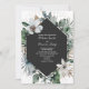 Botanical wedding design with tropical greenery and white flowers with faux gold background. White text over black geometric design at centre.