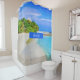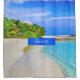 Personalised Tropical beach themed family shower curtain. Features sandy coastline with palm trees and beachy sea. Personalise with family name or your text. Click the "Customise it!" button to change the text size, text colour, font style and more!