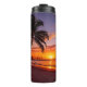 A tropical beach at sunset, with calm water, a colourful sky, and graceful palm trees creates a gorgeous travel mug.