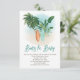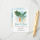 Bring a book! Tropical beach Baby on board surf baby shower bring a book featuring exotic palm trees, bird of paradise watercolor illustration and a destination tropical beach with sand and turquoise blue ocean, with 2 surf boards in brown boho wood and turquoise with a cool font brush script. Perfect for spring and summer baby shower or exotic destination baby showers!