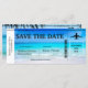 A tropical beachside image is the background for this Boarding Pass Destination wedding Save the Date.